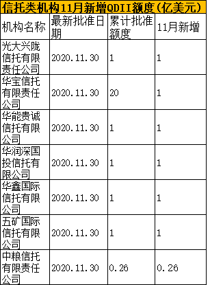 光大兴陇信托、华能贵诚信托等6家此前没有QDII额度的信托也在11月喜提QDII额度。