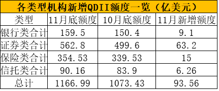 外管局最新数据显示,截至2020年11月30日,《合格境内机构投资者(QDII)投资额度审批情况表》显示,相比10月末,11月各类机构新增QDII额度93.56亿美元。