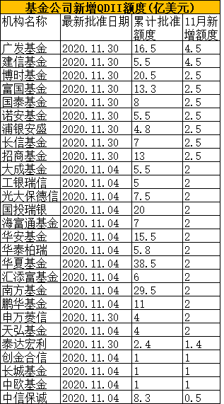 基金公司在此类新增额度中斩获颇丰,数据显示,27家基金公司11月单月合计新增57.4亿美元QDII额度。