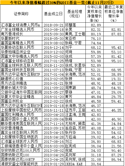 Wind数据显示,截止11月27日,今年以来共有13只QDII基金年内收益超过50%,汇添富全球消费、广发全球精选、南方香港成长3只基金今年以来净值增长超过80%,是近年来难得的大丰收之年。