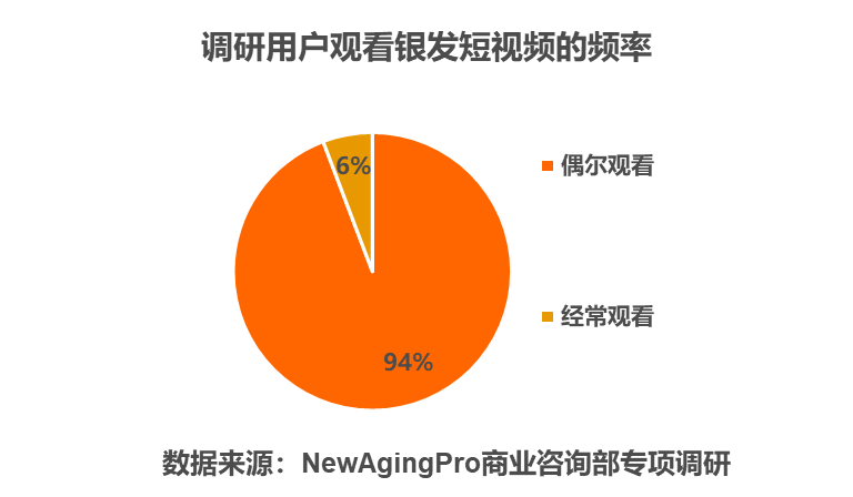 根据数据显示,94%的用户选择偶尔观看银发短视频,只有6%的用户会经常观看。这个数据说明大部分年轻人较少会主动关注或搜索银发题材相关的短视频,大多是在随机刷到视频的情况下才会去观看。