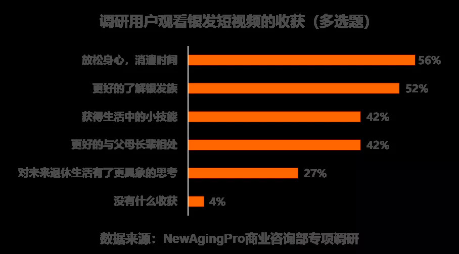 根据数据显示,56%的年轻人认为观看视频能够让他们放松身心,消遣时间。52%的年轻人通过观看短视频更加了解了银发族这一群体,改变了之前对于这个群体的刻板印象。