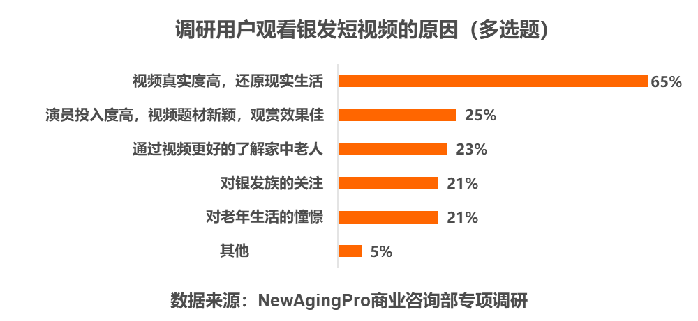 第二,效果佳。25%的年轻人更看重视频的呈现效果。银发视频题材新颖,内容丰富,演员投入度高,观赏效果很好。