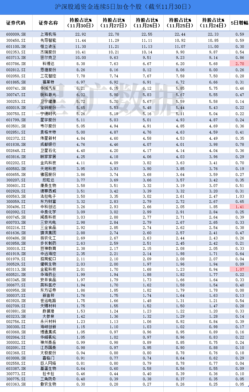 截止11月30日数据显示,64只个股连续5日获沪深股通加仓,其中科博达(+2.70%)、中科创达(+1.41%)、金能科技(+1.07%)等3只增幅居前;从行业看,计算机应用(14.1%)、化学制品(6.3%)占比较多。