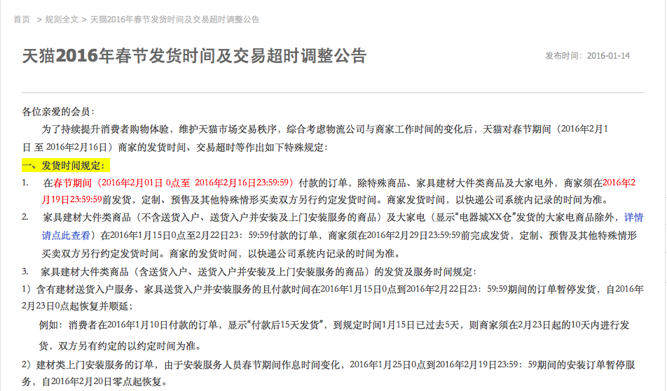 其次,淘宝要求凡消费者于2月1日至2月16日期间购买的小件商品,卖家必须要在2月19日(正月十二)之前发货;对于家装建材、大家电等大件商品,从1月15日-2月22日付款订单暂停发货,卖家必须在2月29日前发货。定制、预售及其他特殊情形买卖双方另行约定发货时间。商家发货时间,以快递公司系统内记录的时间为准。