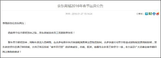 在春节物流保障方面,拥有自营物流的电商显然更加给力。京东商城发布的2016年春节运营公告中称,京东物流春节期间将确保小件订单88个城市不打烊,大件商品87个城市以及139个京东帮县级区域不打烊。