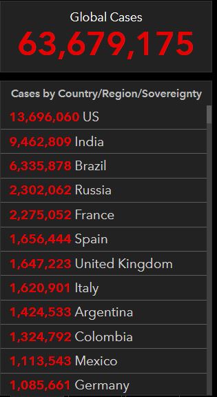 据约翰斯·霍普金斯大学的疫情追踪数据,截至北京时间12月2日上午8点,全球累计确诊新冠肺炎病例63679175例,死亡1476949例。
