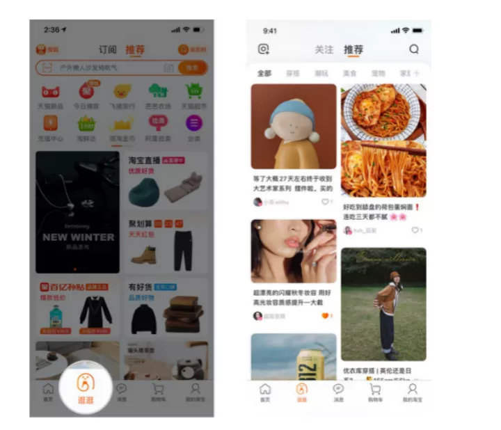 手淘此次改版最大的变化就是将淘系原有的内容整合,推出中心化的内容平台“逛逛”。其内容一是来自于此前分散在商品页面的达人买家秀,二是淘宝正鼓励内容创作者、普通用户和商家产出原创内容。