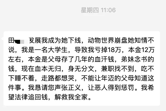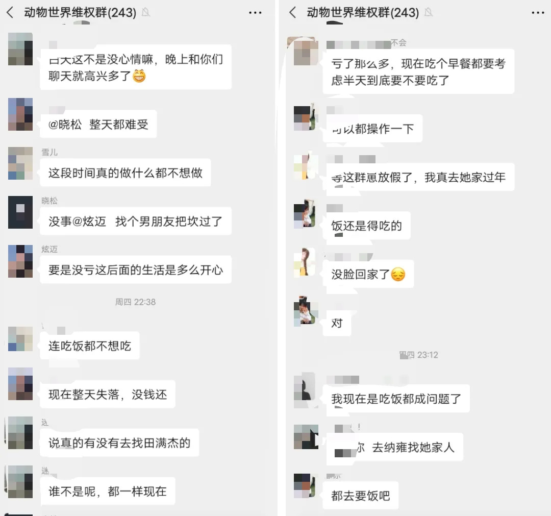 到了11月底,包括钟红、李欣在内的动物世界玩家,看到了盟主李洁在群里的公告称,大家趁年关将至,可以多多投入,能够迎来更大的回报,然而这一纸公告确实晴天霹雳的开始。