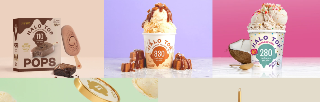 最典型的例子就是Halo Top,一家2012年成立、2019年才改换包装的年轻品牌,六年间的复合年增长率高达462%。品牌有Dairy、Dairy-Free、Keto、Pops四个系列,前三种每一杯的热量控制在280-380卡路里,Pops冰淇淋棒则控制在50-110卡路里。