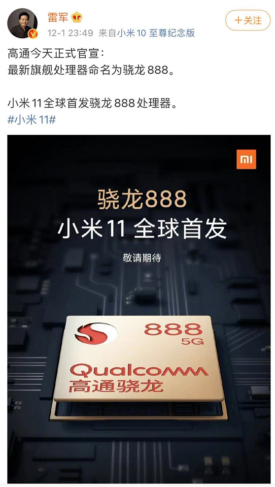 这一次的高通技术大会,最有意思的一幕莫过于发布会刚进行过半,骁龙888还未登场,雷军就已经在微博上公布小米将全球首发骁龙888。