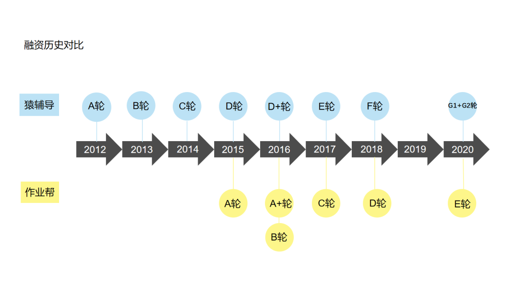 如果对比相同轮次,猿辅导E轮融资1.2 亿美元,远低于作业帮的融资额,作业帮的估值也就得到了更客观的体现。