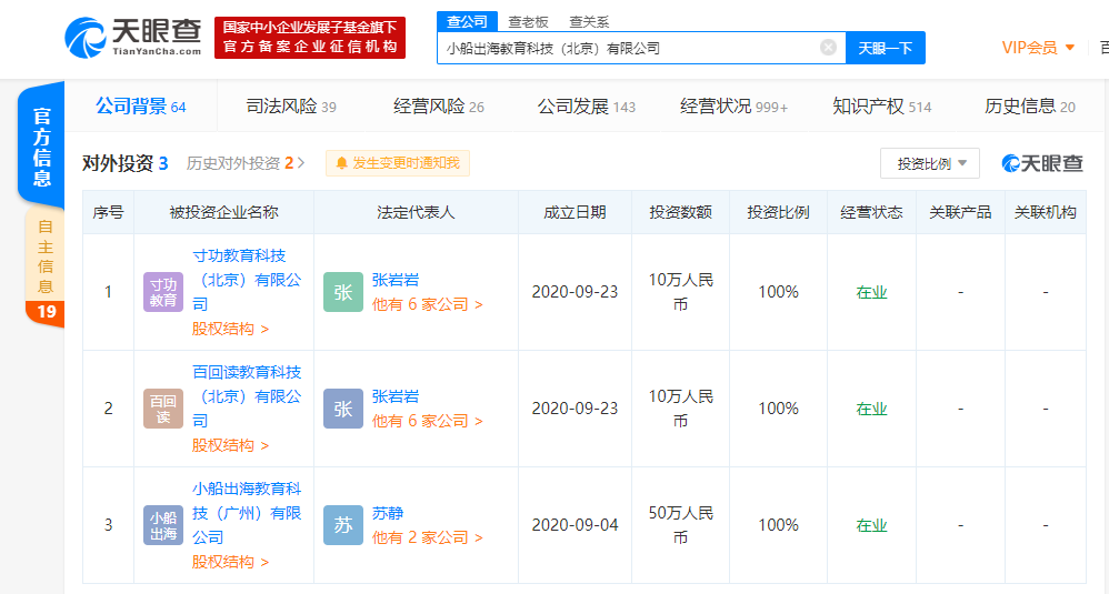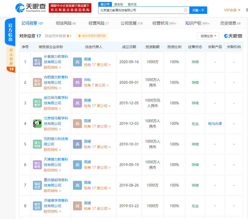 而除了融资轮次的因素,目前双方发展逻辑的不同也是重要原因。天眼查显示,猿辅导对外投资数量为17家,作业帮对外投资数量仅有3家。