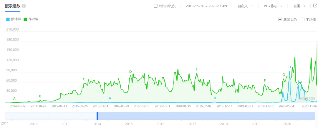 另外,百度指数显示,2014-2020年之间,作业帮被搜索频次明显高于猿辅导。今年3月底4月初,猿辅导的搜索次数第一次超过作业帮,这个时间正值猿辅导公布完成新一轮10亿美元的融资。随后在今年7月中旬,正值暑期,猿辅导的搜索次数第二次超过作业帮。