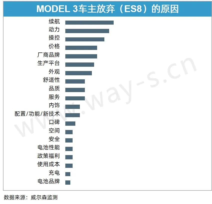 续航、动力操控、价格和品牌是促使ES8潜在车主转向MODEL 3的重要原因。ES8已购车主对于续航、充电时间和价格也表示不满,值得关注。