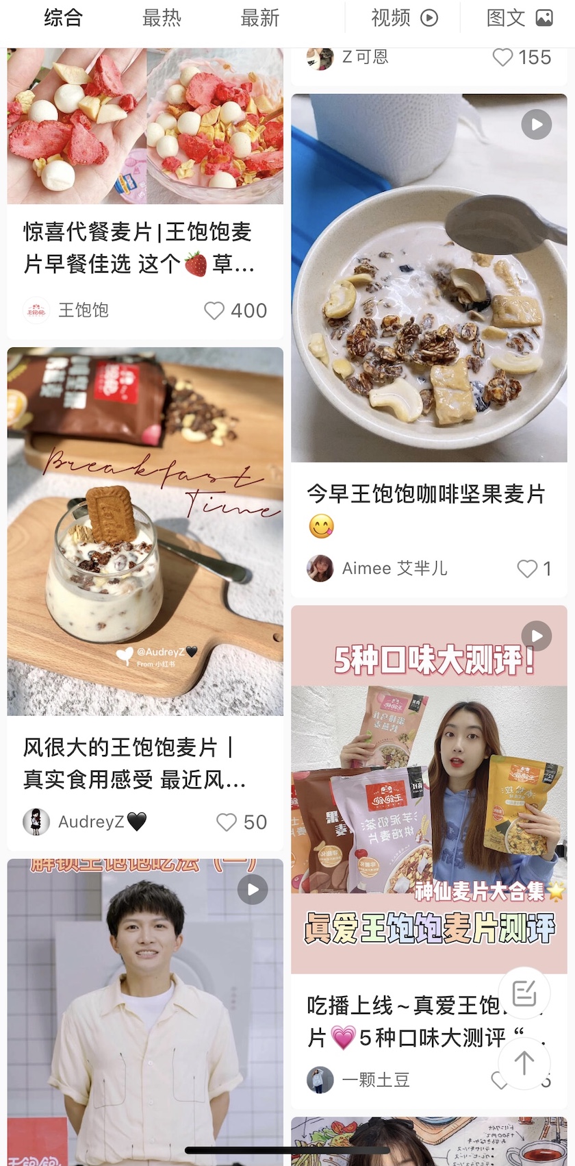 在微博、小红书等平台上,你很容易找到有用户分享自己的王饱饱麦片早餐照片。图片中,通常是在一个透明玻璃杯里放入用牛奶、酸奶冲泡的大片麦片,上面一定会有色彩明亮的果干、坚果等进行点缀,配文可能是“超模同款燕麦杯”。