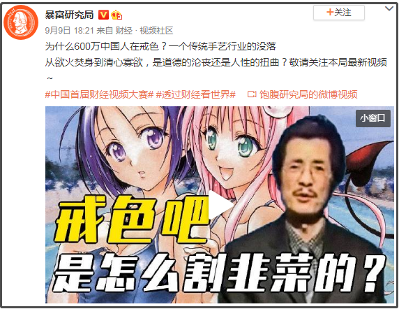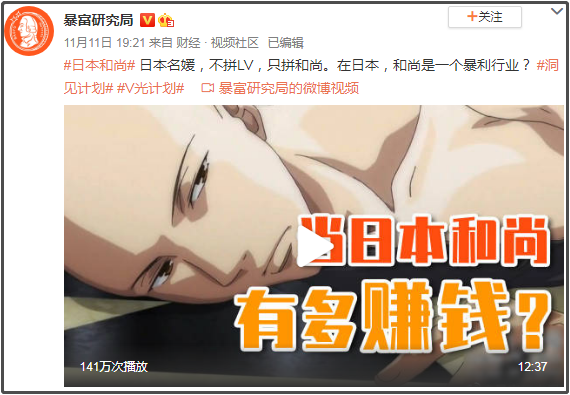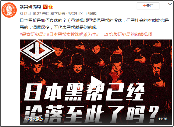 事实证明,@暴富研究局 真的在微博创造了热门。他们5月发布的超过5分钟时长的视频《在加纳,葬礼是个暴富产业》播放量超过300万,8月发布的11分钟多的视频《日本黑帮是如何衰落的》更是被很多大V名人转载,越来越多的人记住了这个萌萌的财经小公主,并喜欢上了她幽默轻松的表达方式,跳脱视野的新奇观点。