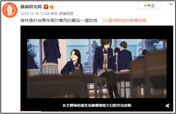 12月18日,经过近一个月时间打磨,“暴富研究局”推出了第四期视频《裤袜是时尚青年面对寒风的最后一道防线》,视频内容比之前几期更加轻松有趣,通俗易懂。与此同时,他们也转变了发布思路,将主阵地放在了微博上。