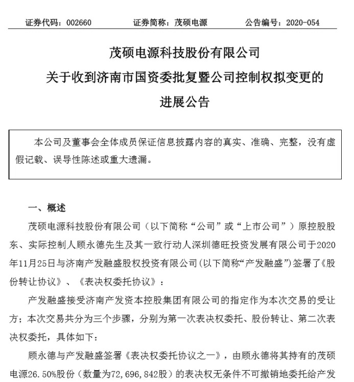 公告显示:产发融盛于2020年11月27日收到济南市国资委出具的《关于济南产发融盛股权投资有限公司协议受让茂硕电源科技股份有限公司股份有关事项的批复》(济国资收益[2020]7号),同意产发融盛协议受让茂硕电源32,651,540股股份,占总股本的11.90%,股份转让协议总价404,226,065元人民币。