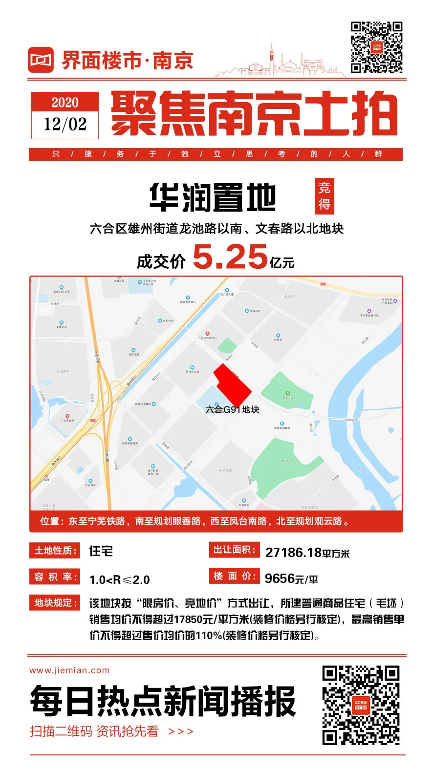 2、经过18轮竞价,六合G91地块触顶最高限价,经过摇号,被华润以5.25亿元拿下,楼面地价9656元/㎡,未来毛坯限价17850元/㎡。