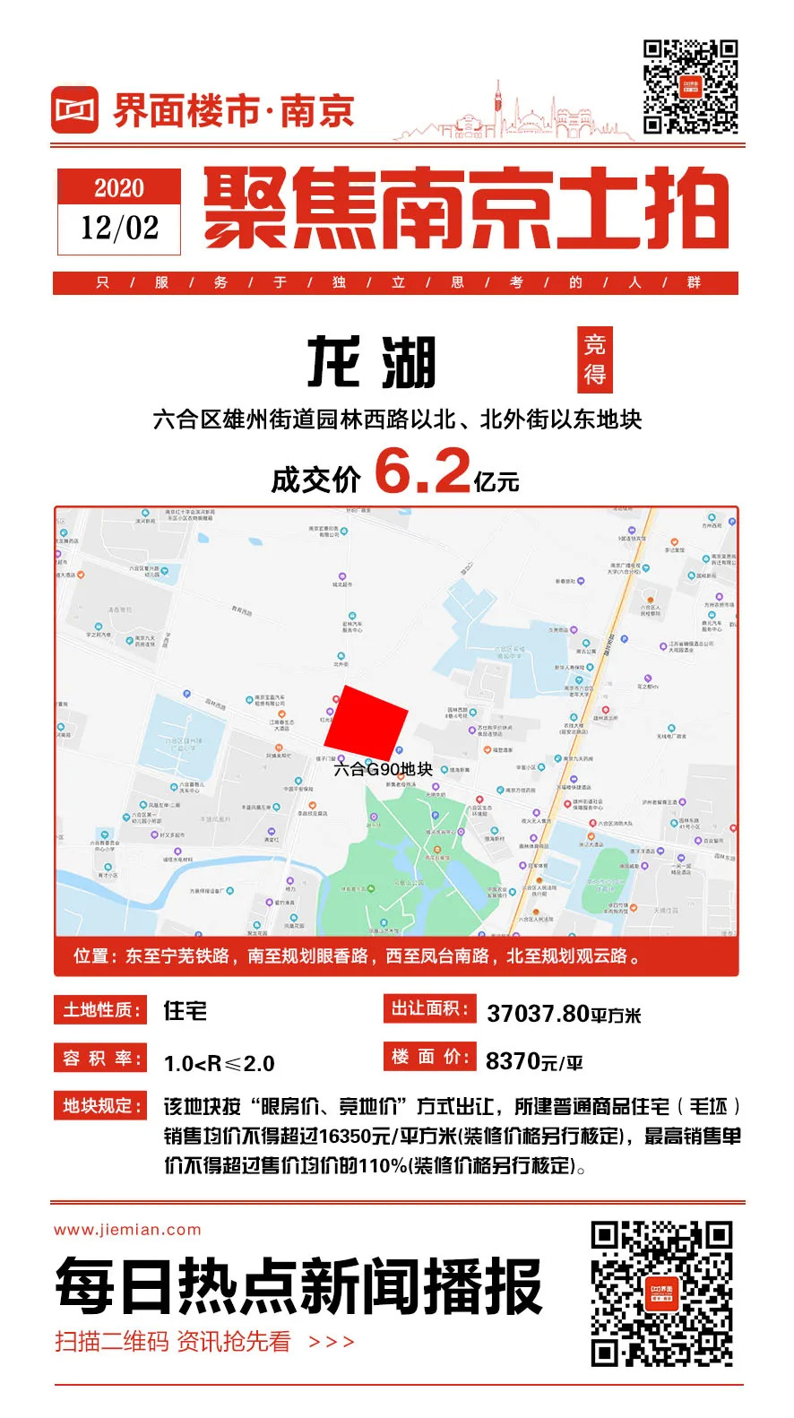 1、经过11轮竞价,六合G90地块触顶最高限价,经过摇号,被龙湖以6.2亿元拿下,楼面地价8370元/㎡,未来毛坯限价16350元/㎡。
