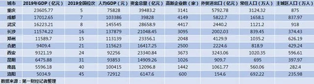 根据2019年的数据,全国GDP十强城市中,中西部占据三个名额——重庆、成都、武汉。