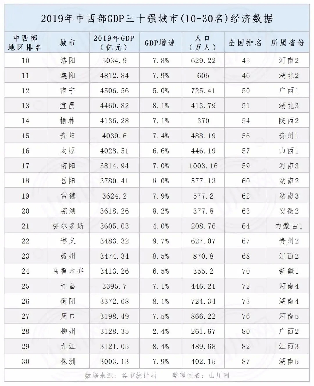 根据“山川网”整理的中西部地区经济总量前30位的城市名单,我们应该能够看出个大概:
