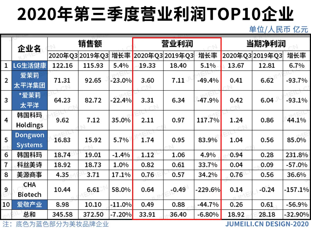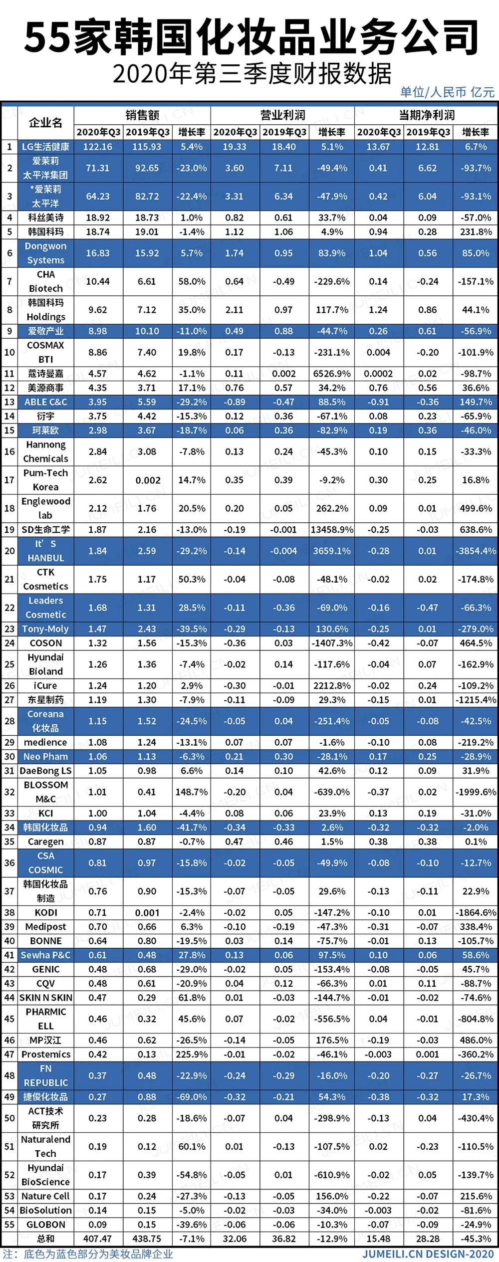 为进一步了解韩国化妆品企业最新的基本情况,聚美丽整合了55家韩企的第三季度财报数据: