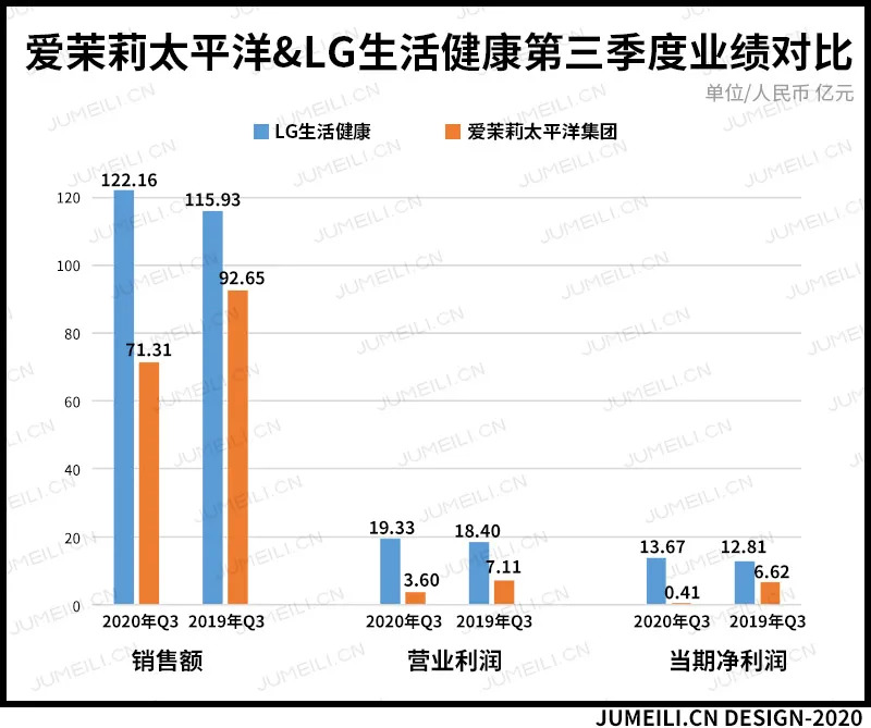 在第三季度,LG生活健康和爱茉莉太平洋分别实现了约122亿元和约71亿元的销售额。两家公司差距的加大主要源于爱茉莉在利润上的下降,LG生活健康第三季度的营业利润约19.33亿元,而爱茉莉却仅有3.6亿元,不足前者的五分之一。