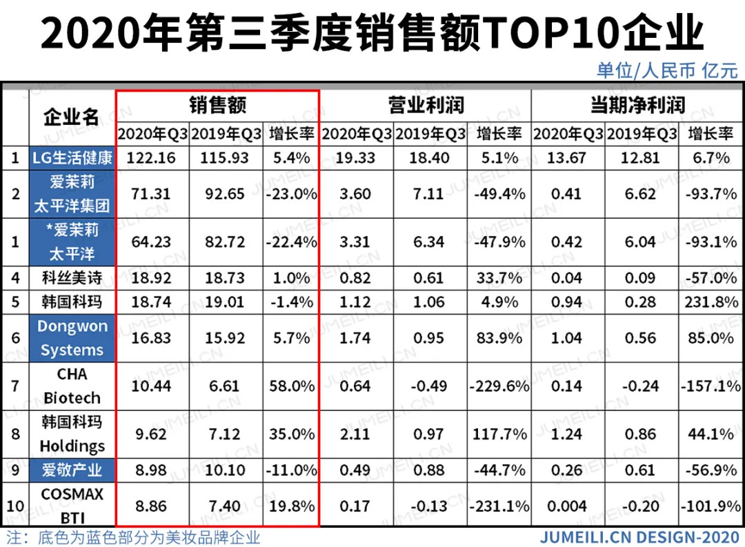 根据上表显示,在第三季度,LG生活健康、爱茉莉太平洋集团、爱茉莉太平洋、科丝美诗、韩国科玛、Donwon Systems、CHA Biotech、韩国科玛Holdings、爱敬集团和科丝美诗BTI分别排在TOP10中。