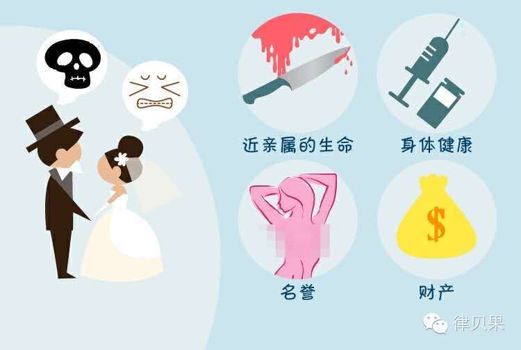 行为人(胁迫人)以给另一方当事人或者其近亲属的生命、身体健康、名誉、财产等方面造成损害为要挟,迫使另一方当事人违背真实意愿结婚的情况。
