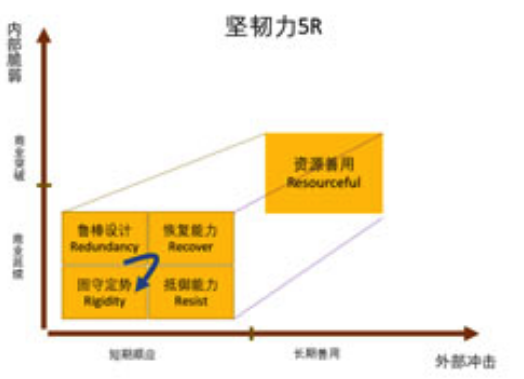 假如坚韧力只关注商业延续,恢复和抵御的“好”效果会鼓励企业增加同一种类后备资源,强化鲁棒设计,落入维护旧模式的循环。