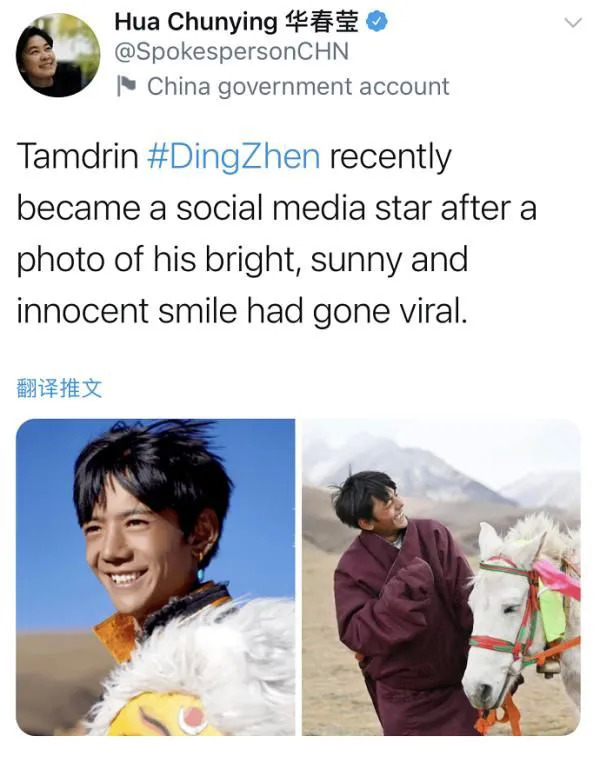 让人意外的是,丁真还火到了国外,外交部发言人华春莹在推特上连续发布三条与丁真相关的内容,包括在四川广电播新闻、走红的照片以及丁真的自我介绍,官方代表的背书为丁真带来了更多的关注。#丁真登上日本电视台#这一话题还登上了微博热搜,报道了丁真意外走红的经过,题目为“因为太帅而成了观光大使、在社交网络上人气爆棚的19岁少年”。在各方的推动之下,丁真不仅仅是藏区少年的形象代表,还成为中国对外的一张名片。