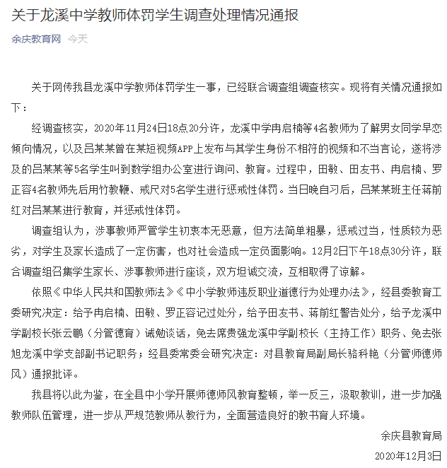 12月3日,余庆教育网微信公众号通报龙溪中学教师体罚学生调查处理情况。通报称,经调查核实,11月24日18点20分许,龙溪中学冉启楠等4名教师为了解男女同学早恋倾向情况,以及吕某某曾在某短视频App上发布与其学生身份不相符的视频和不当言论,遂将涉及的吕某某等5名学生叫到数学组办公室进行询问、教育。过程中,田敏、田友书、冉启楠、罗正容4名教师先后用竹教鞭、戒尺对5名学生进行惩戒性体罚。当日晚自习后,吕某某班主任蒋前红对吕某某进行教育,并惩戒性体罚。