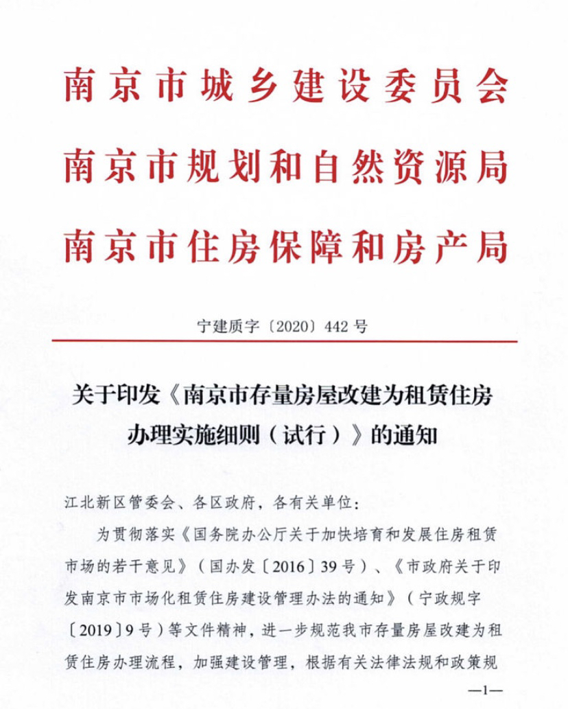 空置的商业办公楼、酒店、厂房,可以改建成租赁住房吗?当然可以!但是什么样的存量房适合改建呢?消防设计审查手续怎么办理? 改建后的租赁房能否出售?记者从南京市建委了解到,近日,南京市城乡建设委员会、南京市规划和自然资源局、南京市住房保障和房产局联合拟定了《南京市存量房屋改建为租赁住房办理实施细则(试行)》(下称《细则》),进一步规范南京存量房屋改建为租赁住房的办理流程。