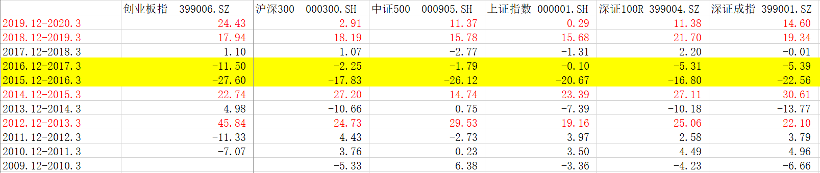 各大指数普跌的年份仅两个,分别是2015年12月-2016年3月、2016年12月-2017年3月(如上图标黄所示)。