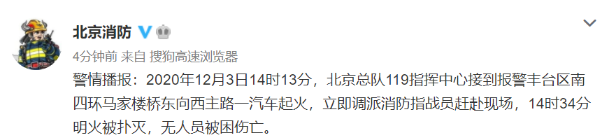 据@北京消防 微博消息,2020年12月3日14时13分,北京总队119指挥中心接到报警丰台区南四环马家楼桥东向西主路一汽车起火,立即调派消防指战员赶赴现场,14时34分明火被扑灭,无人员被困伤亡。