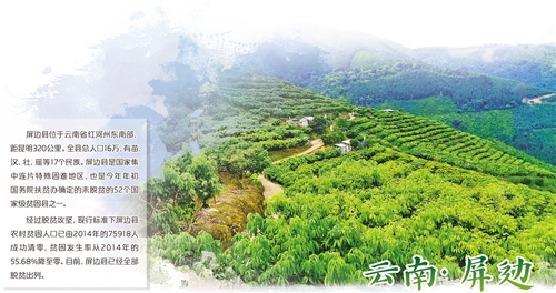高山绵绵,大河奔流。绿油油的果树长满了河谷两侧的山坡。这里就是云南省屏边县。近年来,屏边县将“消除绝对贫困”作为首要任务和第一民生工程来抓,聚焦“两不愁、三保障”,狠抓责任、政策、工作“三落实”,逐一攻克脱贫堡垒,取得了决定性胜利。