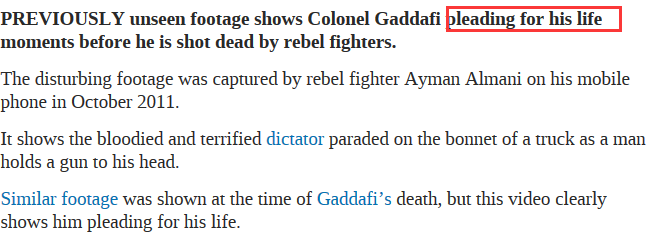 而最新的视频从一个新的视角捕捉到卡扎菲的最后时刻,清楚地看到他乞求士兵放他一条生路的画面。视频显示,卡扎菲被处决之前,士兵们在卡车上疯狂地虐待他,尖叫声不断。可以听到,在被一个枪手指着他满是血迹的头部时,卡扎菲在乞求放他一条生路。