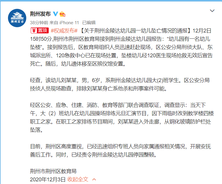 据湖北@荆州发布 微博4日消息,荆州市荆州区教育局通报,12月2日15时50分,荆州市荆州区教育局接到荆州金陵达幼儿园报告:“幼儿园有一名幼儿坠楼”。接到报告后,区教育局组织人员迅速赶赴现场,区公安分局刑侦大队、东城派出所、120急救中心已在现场处置,坠楼幼儿经120医生现场抢救无效后宣告死亡。随后,幼儿遗体移至区殡仪馆安置。
