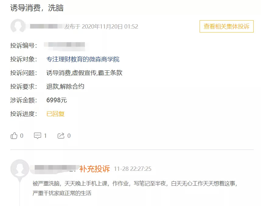 在黑猫投诉搜索“微淼”,共出现194个相关投诉信息,其中便不乏“课程内容不适用”、“虚假宣传,实际学习效果和宣传内容差距很大”、“诱导消费,洗脑”等,而申请退款的金额均为6998元。