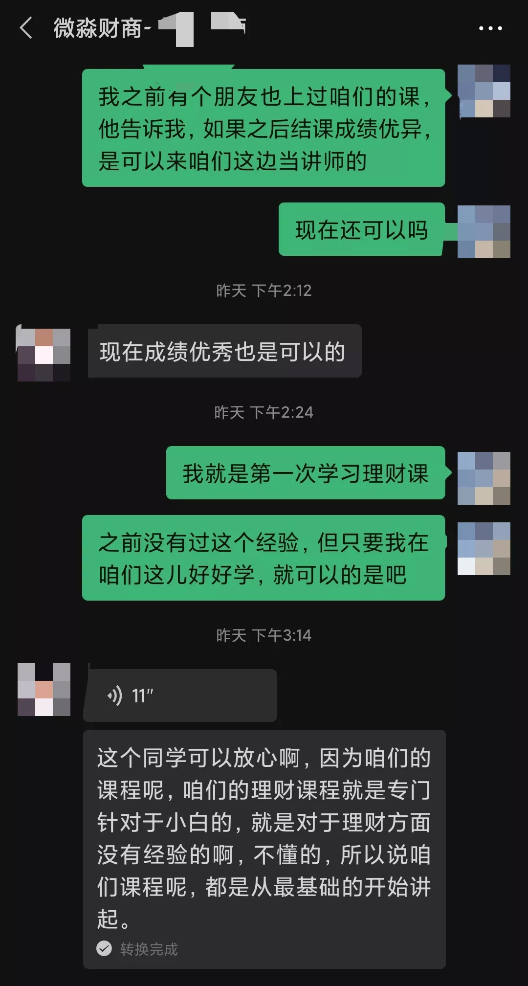 授课在微信群中进行,授课形式主要是微信图片和语音。在微淼的老师看来,这种形式不限学员的学习时间,灵活自由,极为方便。“每次课程大概一个小时左右,但在这一个小时里,真正与理财技巧相关的话术屈指可数,也就那么十来句,其余都是向学员灌输和强调‘理财是如何重要’、‘什么时候开始投资’等等。”