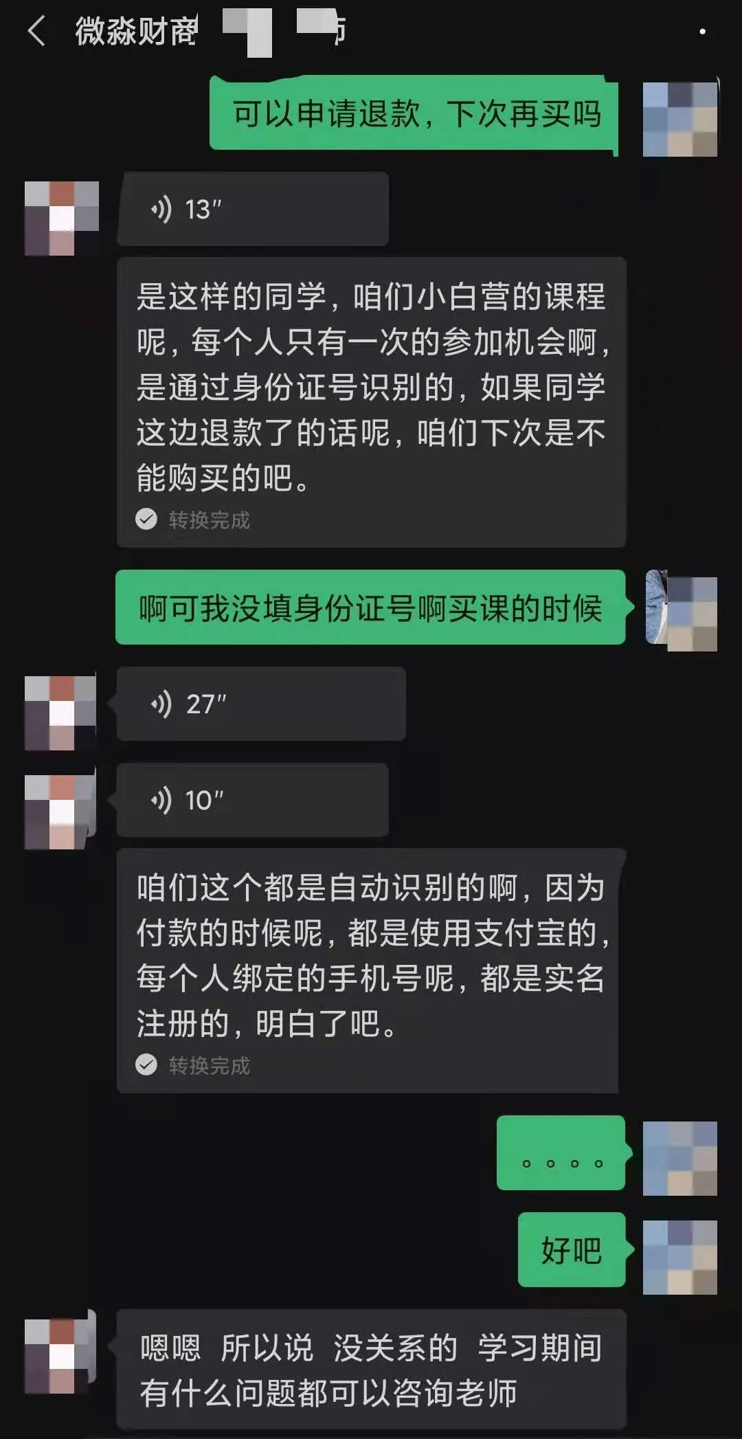 该老师还强调,小白营的课程每人只有一次参加的机会,通过身份证号识别,退款之后便无法再次购买,试图通过这种方式阻止燃财经的退费申请。