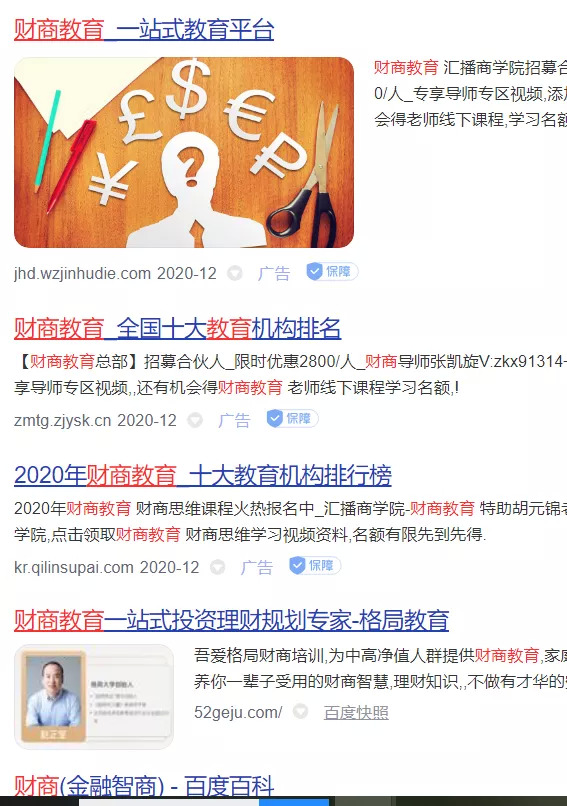 在百度里搜索“财商教育”,排名靠前的财商学院分别为“汇播商学院”、“吾爱格局财商培训”、“资沣堂财商教育培训”、“中大互联在线”等等,且均为广告。