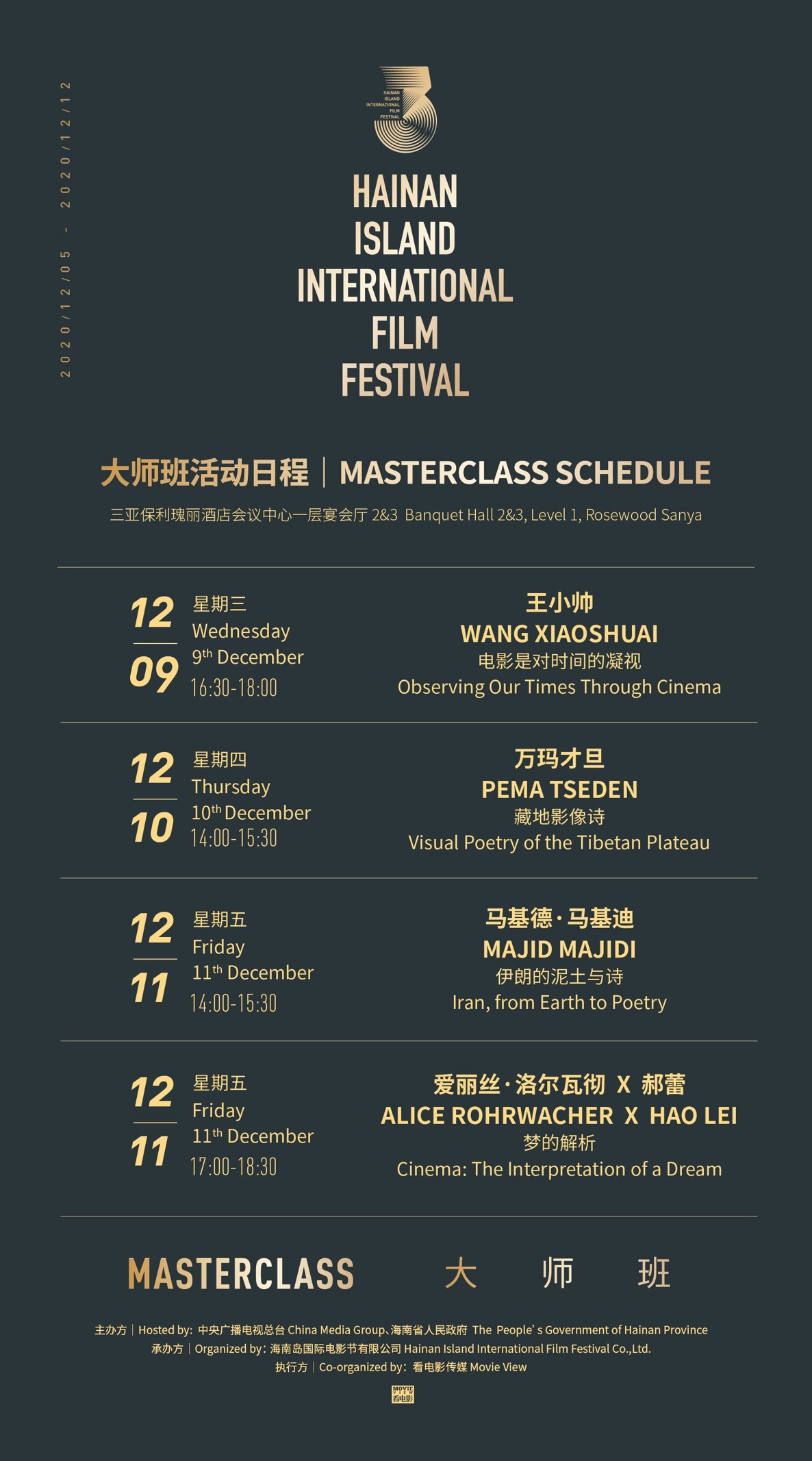 12月4日,第三届海南岛国际电影节·大师班公布嘉宾以及日程安排。本届大师班的五位嘉宾分别是:中国内地导演、编剧王小帅;中国内地导演、编剧万玛才旦;伊朗导演马基德·马基迪;意大利编剧、导演爱丽丝·洛尔瓦彻;中国内地演员郝蕾。届时,五位嘉宾将分别以线下和线上的方式,与数位青年导演以及现场观众进行分享创作心得。