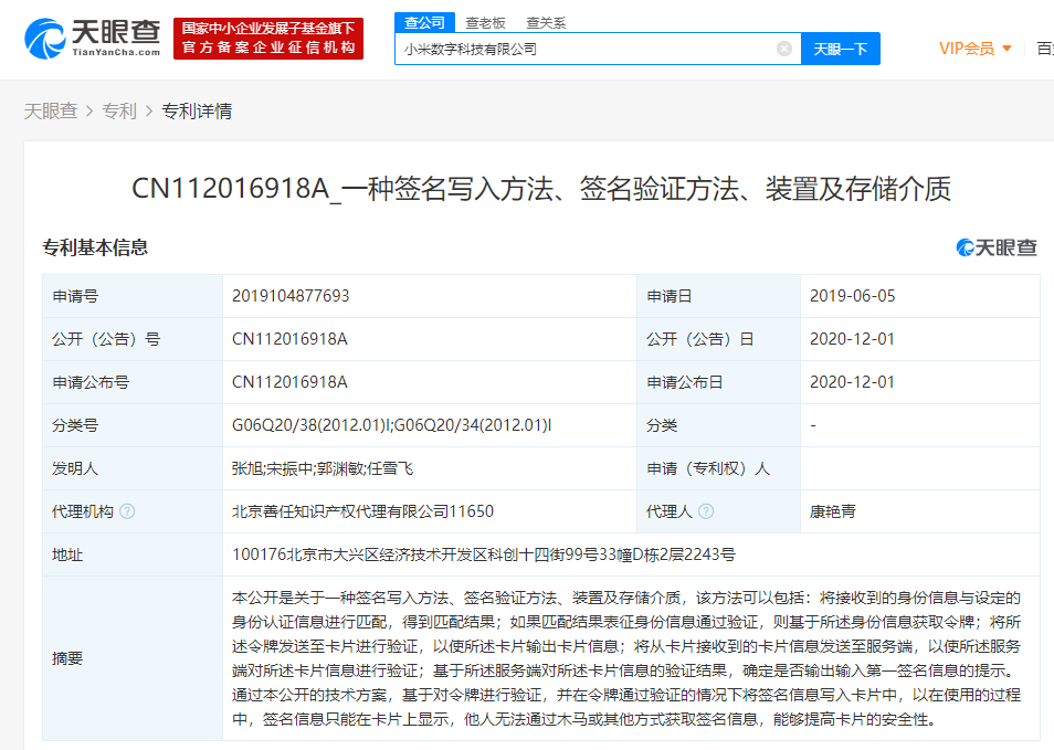 据天眼查APP显示,12月1日,小米数字科技有限公司公开一项专利信息,专利名称为“一种签名写入方法、签名验证方法、装置及存储介质”。申请公布号为CN112016918A,申请公布日为12月1日。专利摘要显示:本公开是关于一种签名写入方法、签名验证方法、装置及存储介质。通过本公开的技术方案,基于对令牌进行验证,并在令牌通过验证的情况下将签名信息写入卡片中,以在使用的过程中,签名信息只能在卡片上显示,他人无法通过木马或其他方式获取签名信息,能够提高卡片的安全性。