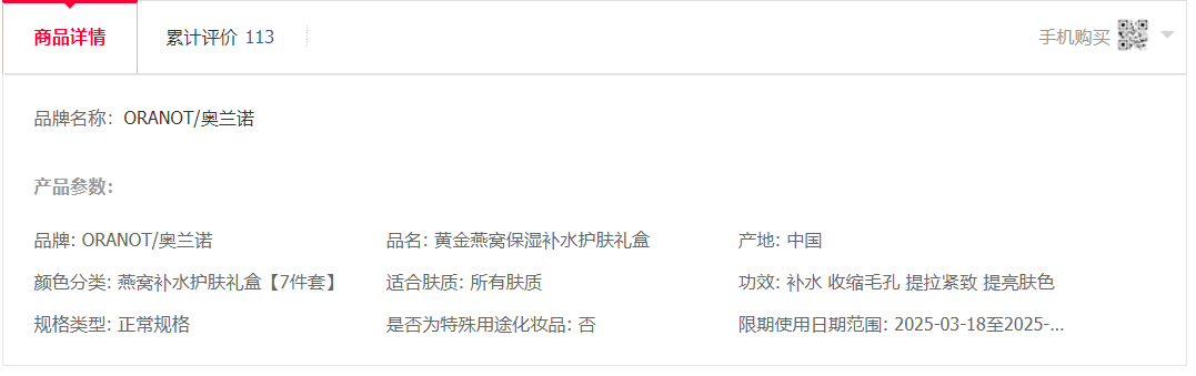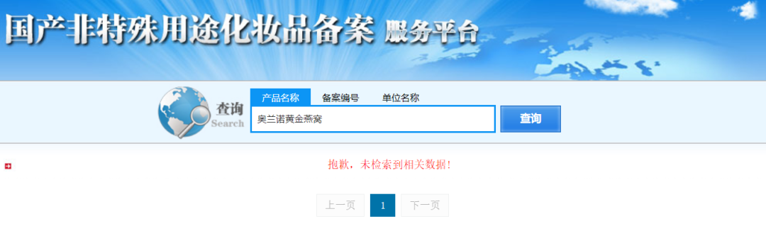 奥兰诺品牌天猫旗舰店内,在售燕窝产品只有一款“黄金燕窝保湿补水护肤礼盒”,但在国家药监局化妆品备案系统中,没有该产品的任何备案信息,涉嫌未备案先上市。
