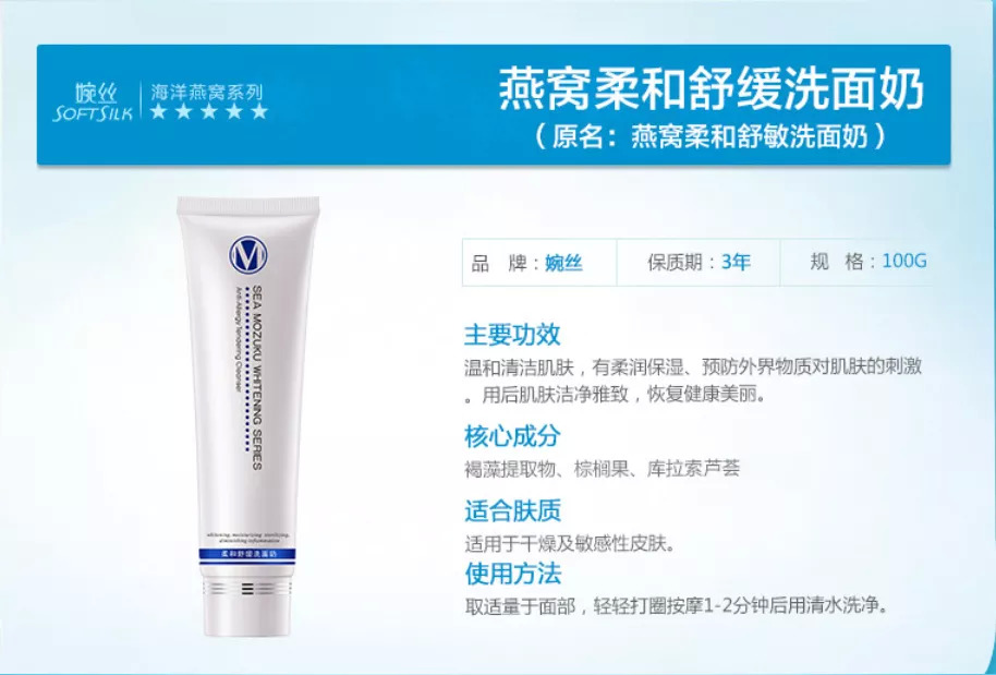 在国家药监局化妆品备案系统上,婉丝品牌备案的燕窝相关产品只有两款,分别为“海洋燕窝控油清爽面贴膜”和“海洋燕窝保湿水活面贴膜”,但在其天猫旗舰店内,这两款产品均无售卖,而在售的海洋燕窝系列产品如浸透控油洁面膏、柔和舒缓洗面奶、幻彩无暇BB霜、舒缓调理修护霜等16款产品,却均无备案。其中“海洋燕窝美白修护滋养水”,宣称的批准文号“国妆特字G20151198”,对应的产品实为“婉丝亮白滋养面贴膜”。