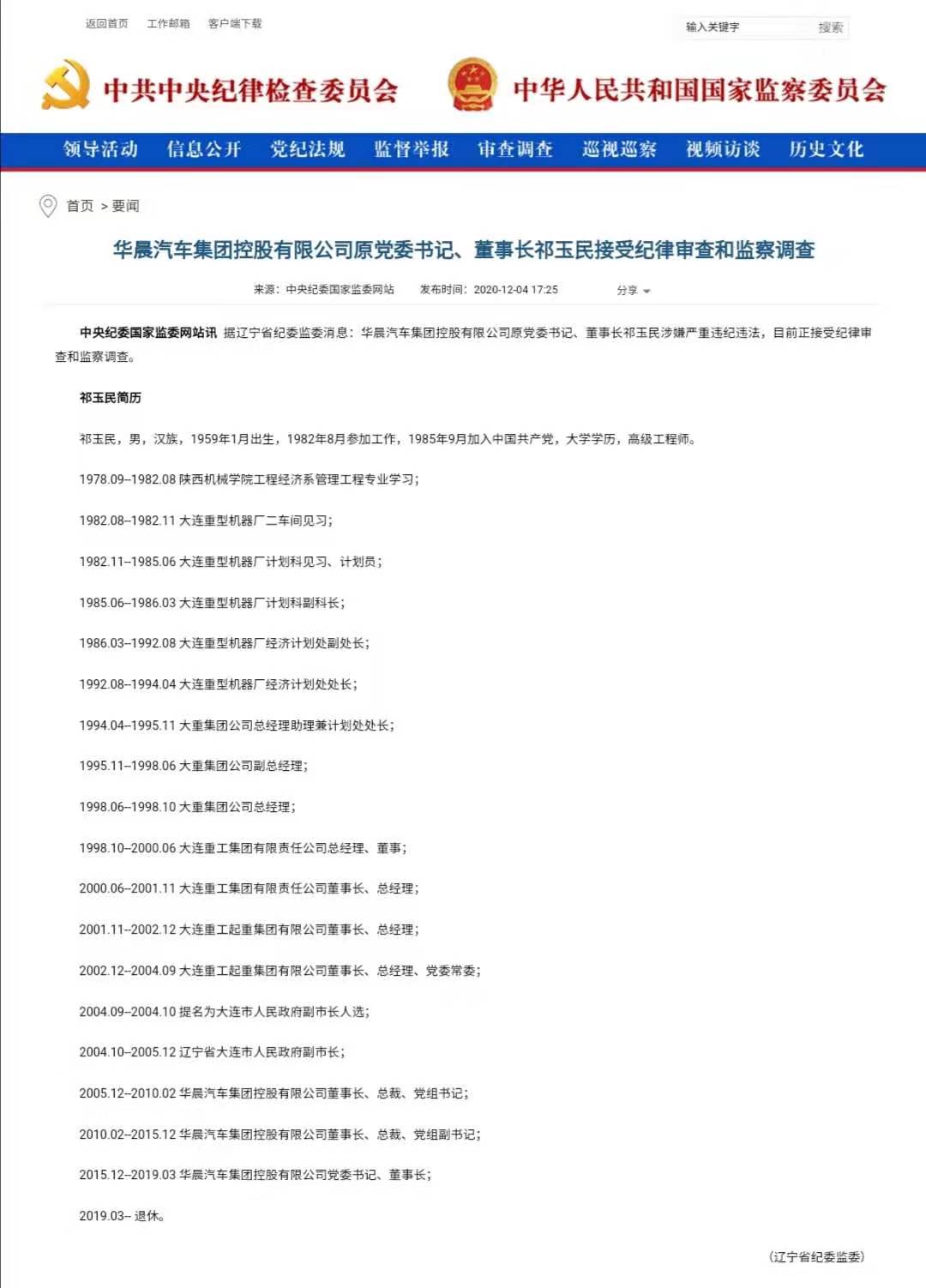 12月4日晚间,中央纪委国家监委网站发布消息称,辽宁省纪委监委已经对华晨汽车集团控股有限公司原党委书记、董事长祁玉民涉嫌严重违纪违法,目前正接受纪律审查和监察调查。