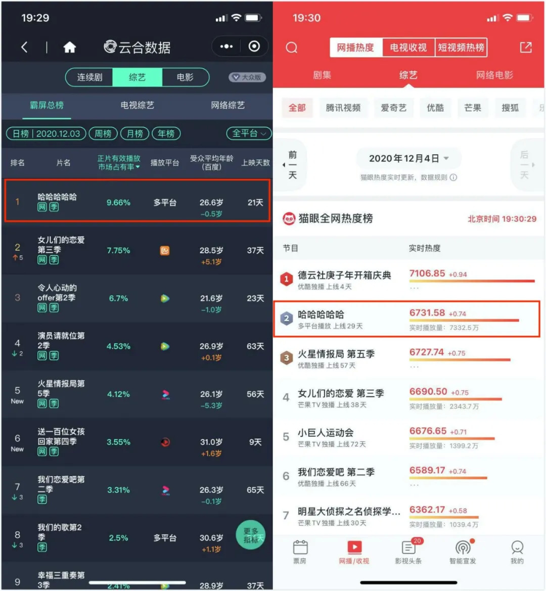 目前,《哈哈哈哈哈》豆瓣评分7.3,云合数据综艺霸屏榜中的日榜、周榜均为第一,猫眼综艺全网热度榜常驻在前5,同时经常有话题冲上微博热搜也说明了节目的话题热度。从市场反馈来看,《哈哈哈哈哈》暂时撑起了观众们的期待,对于长视频平台,这次对户外真人秀的“押宝”也可能影响到行业发展的未来。
